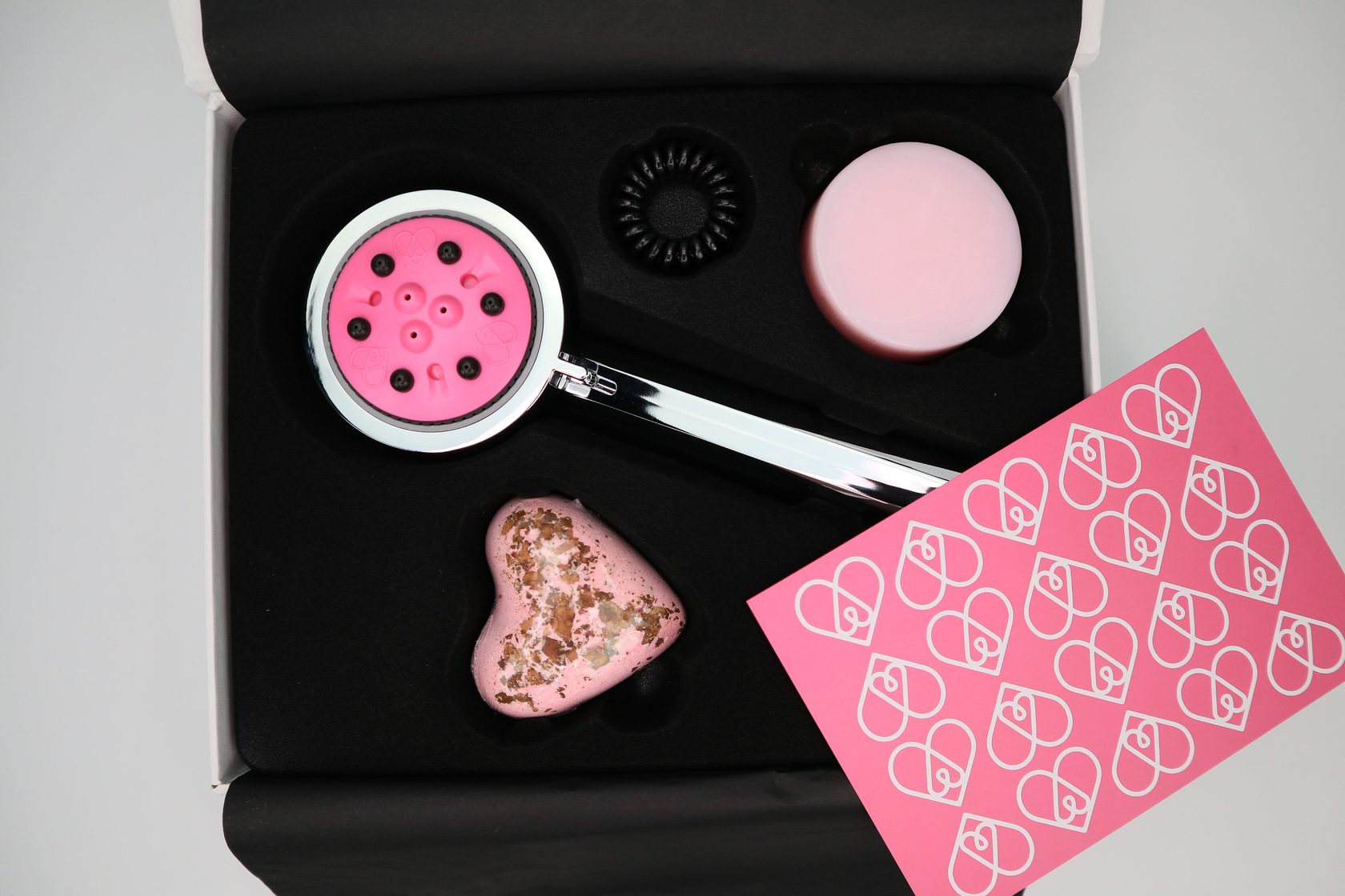 The Love Shower (Pink Panther color) SPA candle for atmosphere. Aromatic bath bomb with rose petals. Hair tie for your comfort.